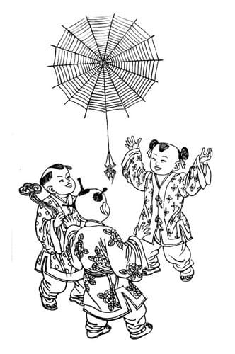 一些較古老的廟宇,廟中畫了蜘蛛網(wǎng),吊著一只拉著蛛絲下垂的蜘蛛,這叫做“喜從天降”。蜘蛛是益蟲,古人認(rèn)為它是可以預(yù)兆吉祥的蟲,老人叫它“喜蟲”。